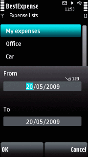 Expense list viewThe first view of the application shows the list of "expense lists". You can create a new list as well as rename or delete an existing list. You can open a list with the corresponding menu command or simply by joystick click on the desired expense list. Expenses viewThis view shows the list of expenses. You can create a new entry as well as edit and modify an existing one. Multiple selection operations are also available. To navigate among expense lists, use the keys "left" and "right". Settings