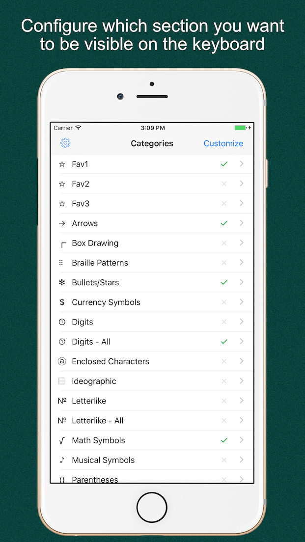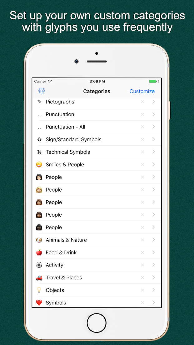 You can configure which section you want to be visible on the keyboard and also set up your own custom categories with glyphs you use frequently.