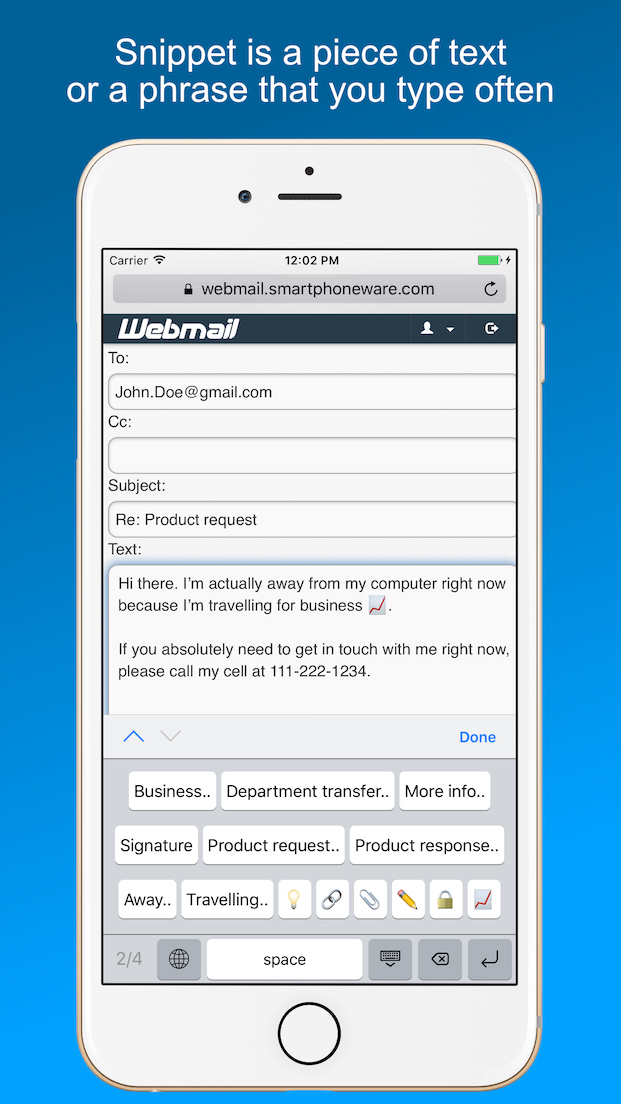 SnippetKeys is a keyboard extension designed to save your time. It expands iPhone or iPad keyboard with custom text snippets.