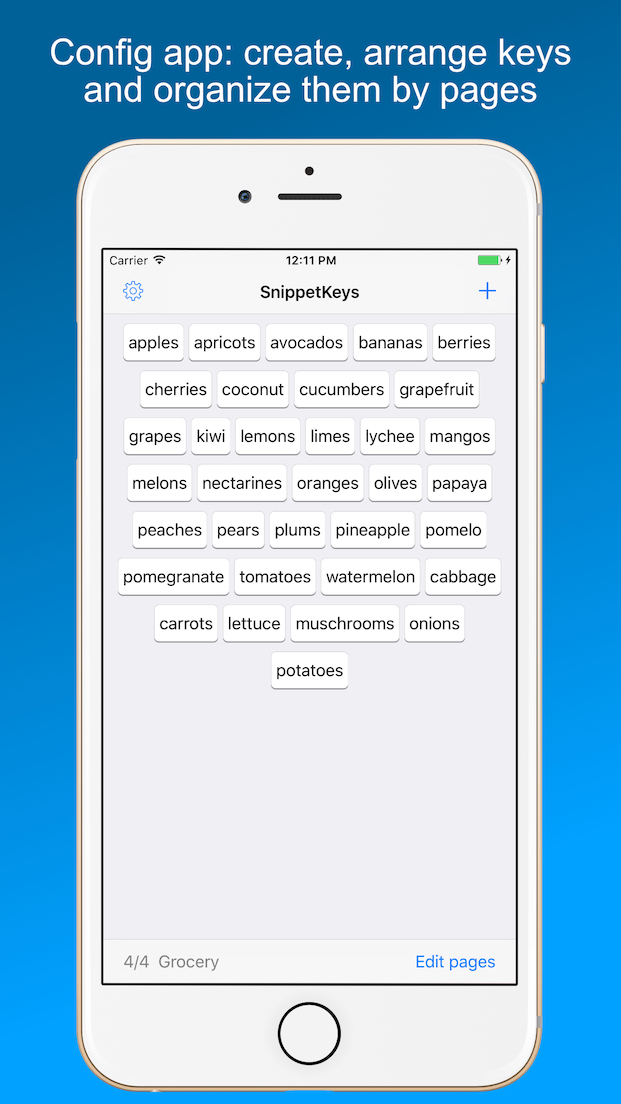 Your snippet is a button on SnippetKeys keyboard now. One key for one snippet, one key to instantly type one complete phrase. In SnippetKeys configuration application you can create as many keys as you want, organize them by pages and drag-and-drop to arrange.